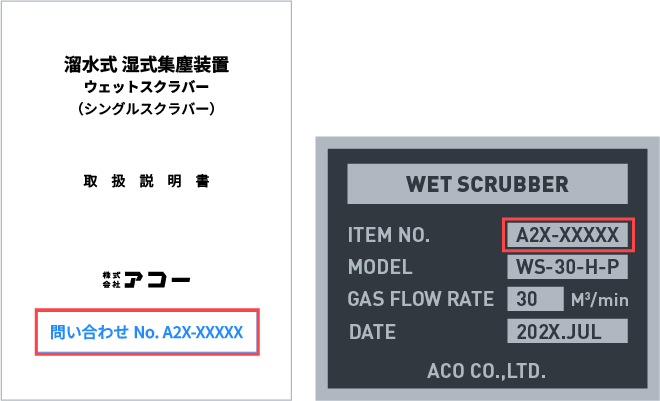 現在ご使用中のアコー製品についてのご相談は、完成図書または装置の銘版に記載されている「問い合わせNo.」や、納入図面に記載の「図番」をお伝えいただけるとご案内がスムーズです。