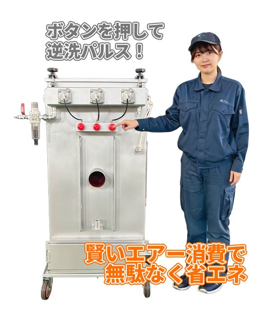 フィルターに付着した粉体は高圧のパルスジェットによるエアショックで瞬間的に払い落とされます。