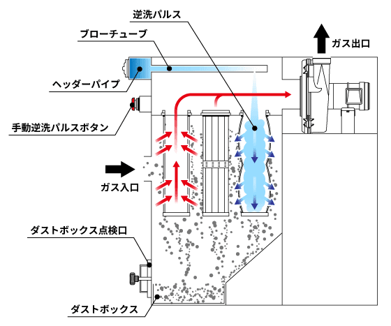 含塵ガスは装置のガス入口から入り、粉体はフィルター外面に付着、ガスは出口から排気されます。