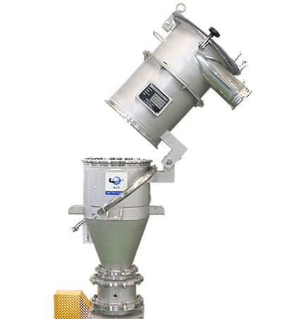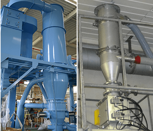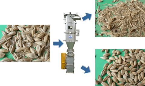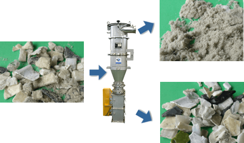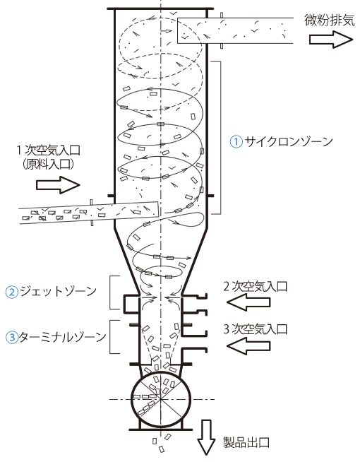 サイクロンゾーンでは、異物は上昇気流に乗って排気され、原料は、重力とともに減速して落下します。