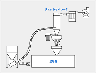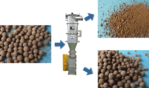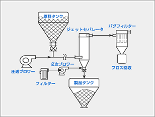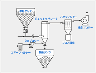ジェットゾーンで、原料に付着した微粉をジェット気流で吹き飛ばします。