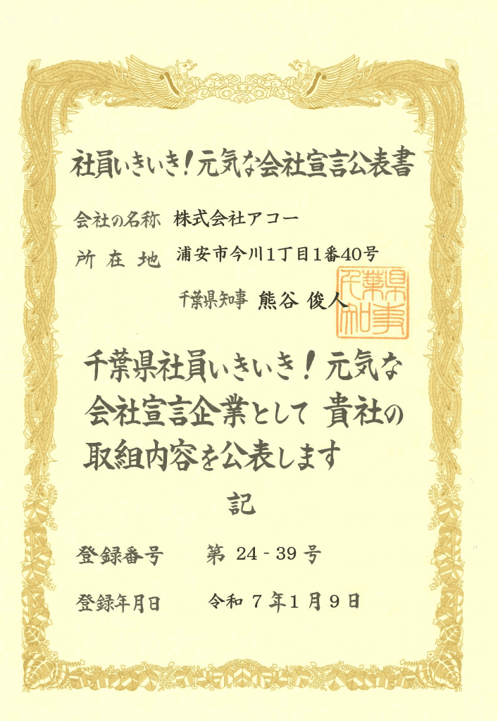 株式会社アコーは千葉県が実施する「“社員いきいき!元気な会社”宣言企業」に登録されました。「“社員いきいき!元気な会社”宣言企業」とは、仕事と生活の両立を支援し、すべての社員が働きやすい職場環境づくりに取り組む企業を千葉県が登録・認定する制度です。