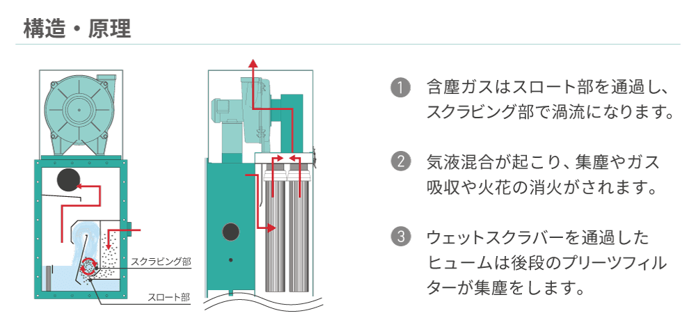 ウェットスクラバーとバグフィルターの良い所を併せ持ち、1台のみの送風機でコンパクトかつ高効率での集塵が可能です。